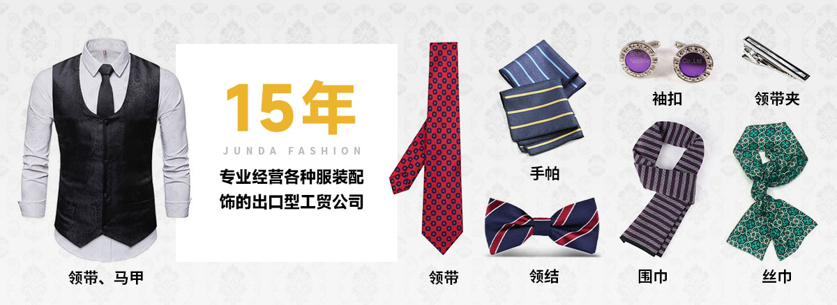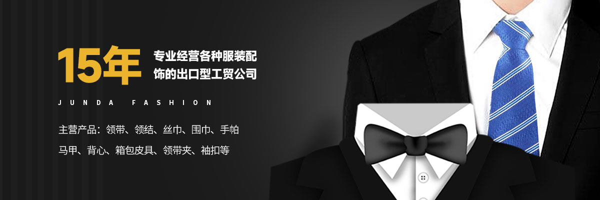 上饒市駿達(dá)服飾有限公司是一家專業(yè)經(jīng)營各種服裝配飾的出口型工貿(mào)公司,公司多年來致力各種男女服裝國際流行配飾的開發(fā)和生產(chǎn),主要產(chǎn)品為領(lǐng)帶、領(lǐng)結(jié)、絲巾、圍巾、手帕、馬甲、背心、箱包皮具、領(lǐng)帶夾、袖扣等,有豐富的內(nèi)外銷經(jīng)驗及廣泛的國內(nèi)外銷售渠道,生產(chǎn)基地管理嚴(yán)格,質(zhì)量過硬,并有一批生產(chǎn)加工企業(yè)長期合作